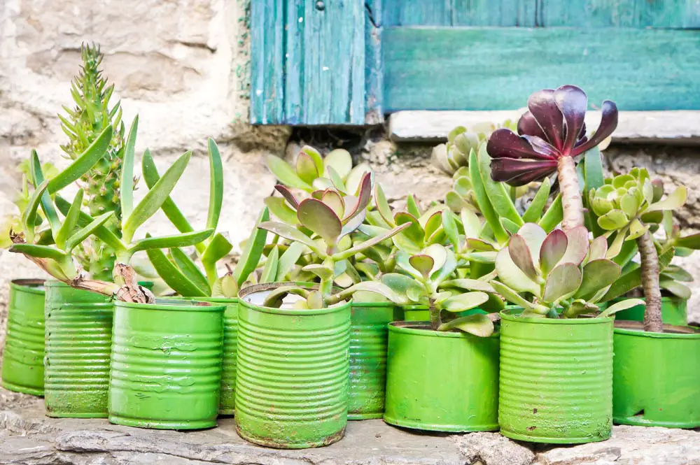 Looking for a bunch of small planters on the cheap? Why not just take your old tin cans, paint them, and use them as planters for small plants? You can even use a can opener to punch holes in the bottom so that any water can drain out.
