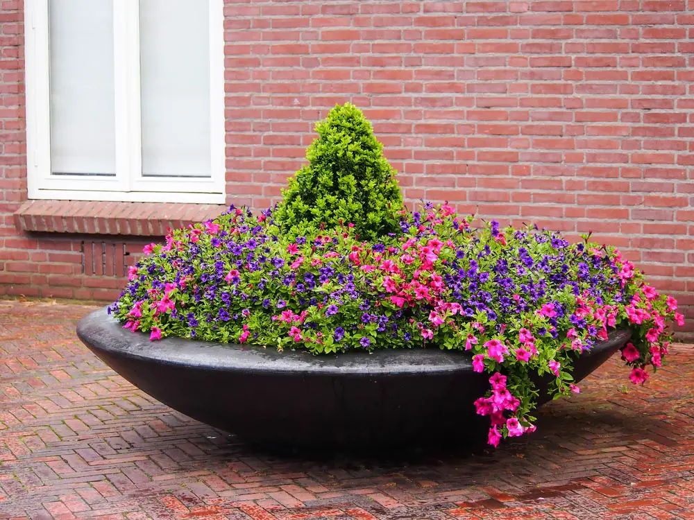 Now this is a planter! A large bowl like this one makes a great centerpiece for a garden patio or display. If you are looking for something to take up space, this might be the perfect solution. Balancing out the width of the planter with the small tree and trailing petunias is just a gorgeous way to fill a large planter.